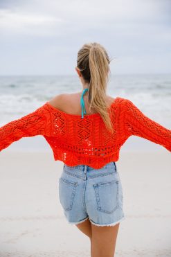 Layer your top and jeans with this scalloped-edged, cropped-short cardigan that ties in the front in an easy bow. Extra-long scalloped bell sleeves add volume and flow to this accessorizing piece. The overall sheer crochet fabrication assures lightweight coverage that shows the top underneath.