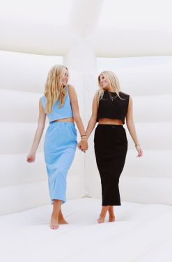 Our Caicos Midi set is a two piece set with a cropped round neck tank top and a midi skirt with pockets and a dry string elastic waist band. This set is made with comfortable fabric and is perfect for any occasion.