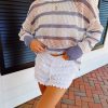 Purple shorts with a ruffle flare detailing! These have stretch and are super comfortable.