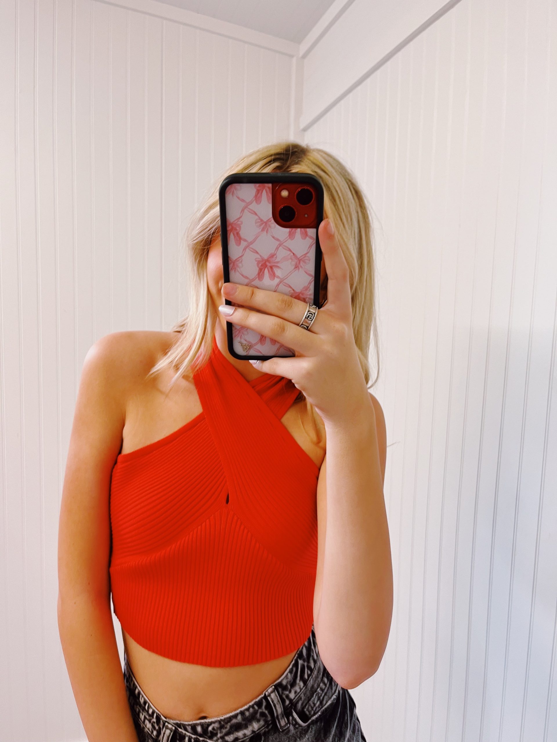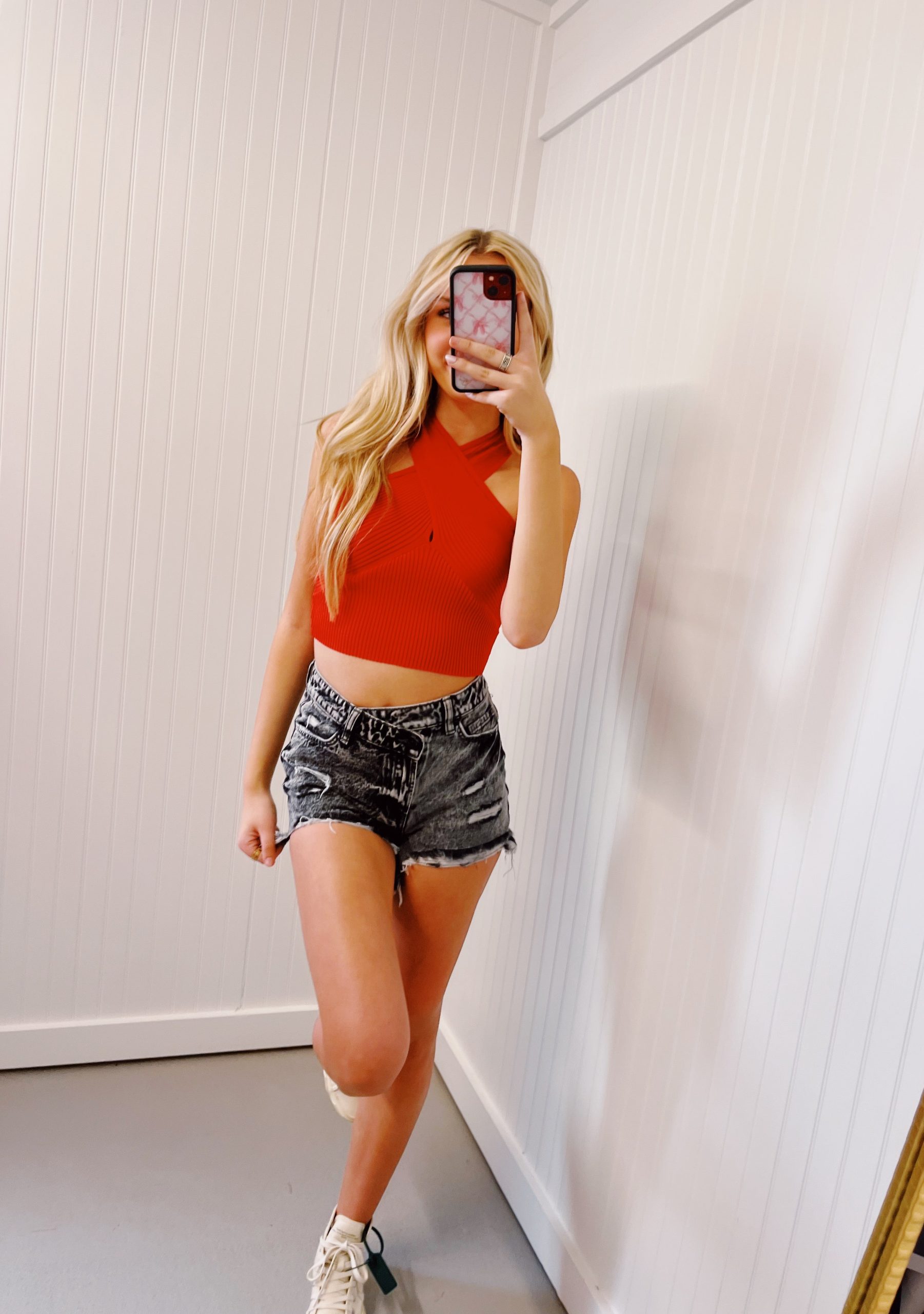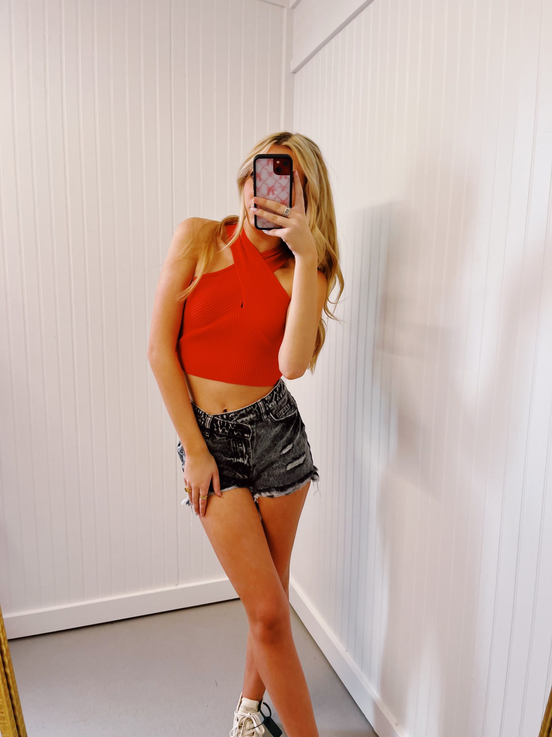 Cross neck cropped knit top that pairs well with jeans or denim shorts! It also pairs well with our Daisy Skirts! Model is wearing a size small.