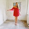 Model is 5’5” with a 34” bust, 27” waist, 36” hips and is wearing a small.