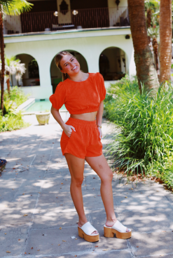 This set calls for an easy look! Hit the tailgate or the town in style in this matching corduroy shorts and top two-piece set. The top has an elastic band at the arms and waist. The shorts have an elastic waist band also.