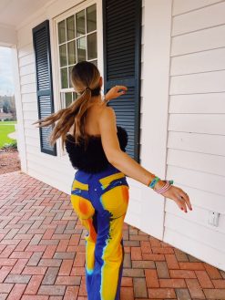 A pair of wide jeans featuring abstract color prints, classic 5-pocket construction and zip-fly closure.