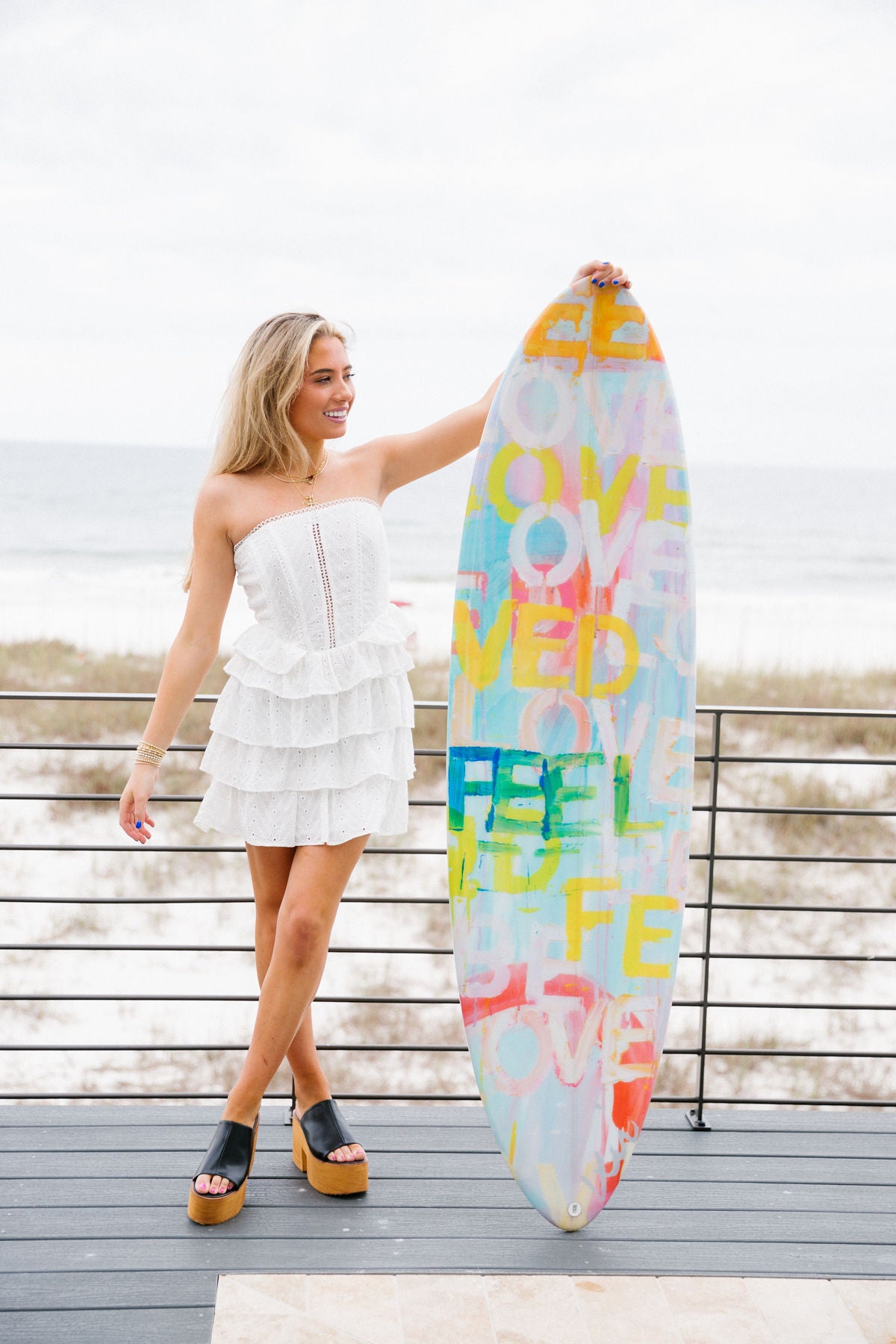 The Lena Eyelet Dress is a charming mini dress that is perfect for any summer occasion. It features a strapless design and eyelet crochet detailing , adding a feminine touch to the look. The slight fit and flare style highlights your figure while the tiered ruffle at the bottom of the skirt adds a playful element to the design. It can be styled with your favorite sandals or dressed up with heels.