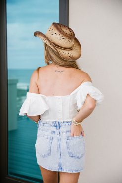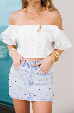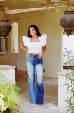 Raw edge flutter sleeve cropped top with a gorgeous back! The back of this top has a fake button detailing and zipper closure. Pair with the Iconic Cargo Denim Mini Skirt.
