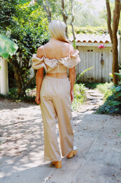 This Paige Two Piece Pants Set is the perfect outfit for any occasion. Crafted with adorning cold shoulder details, this set is a chic look that will elevate your wardrobe. The top features a back zipper with adjustable straps and is double-lined, while the pleat-front pants have an elastic back waistband for unbeatable comfort. Feel incomparable elegance with this stylish set!
