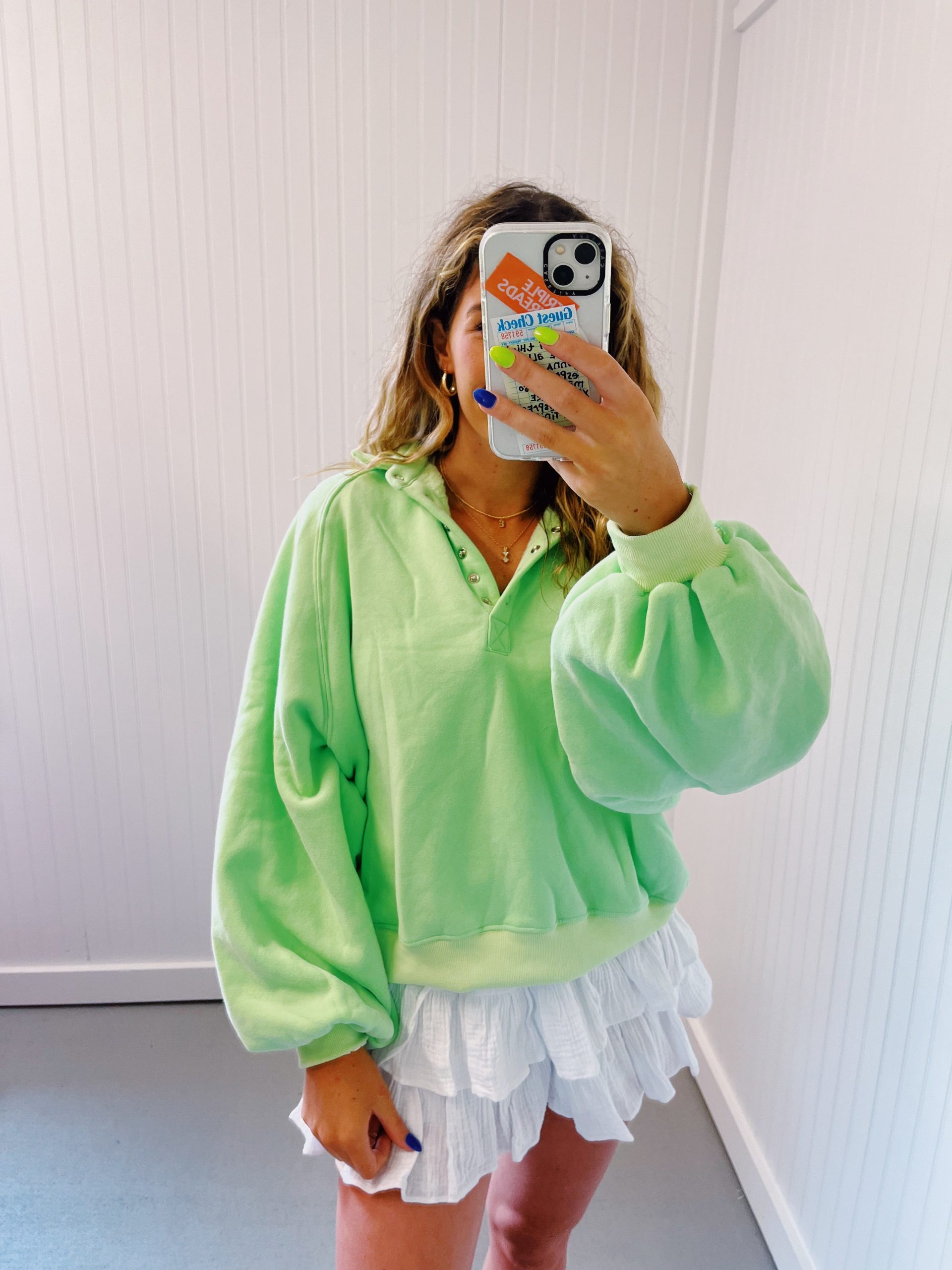 Piper Snap Button Collared Sweater with a washed effect and relaxed fit! Model is wearing a size small.