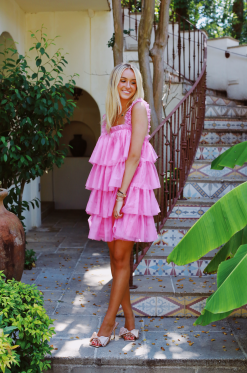 Our Powder Puff Dress is a tiered mini dress with a fun tulle fabric. With ruffle adorned elasticated ruched tank straps and a square neckline, this mini dress features tiers of ruffled tulle in a relaxed A-line. The perfect addition to your closet! It can be dressed up with fun heels or dressed down with cowgirl boots or sneakers. It is fully lined and such an easy fit!