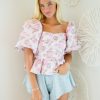 This jacquard-printed ruffled crop top features a zipper closure at the back! It is a stunning pink and red color scheme with the perfect amount of ruffles.