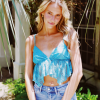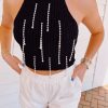 Striped colorblocked eyelet knitted sweater. Model is wearing a size small.
