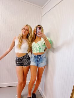 Tie dye cropped top with puffed short sleeves and elastic on the back! This color is so fun and flattering. Model is wearing a size small.